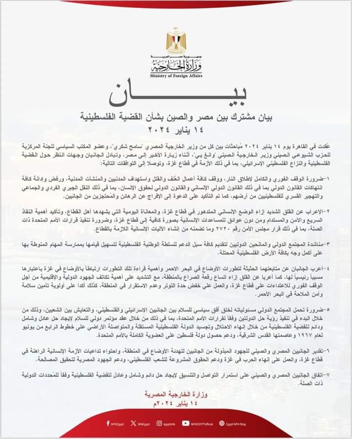 بيان مشترك بين مصر والصين بشأن القضية الفلسطينية اليوم