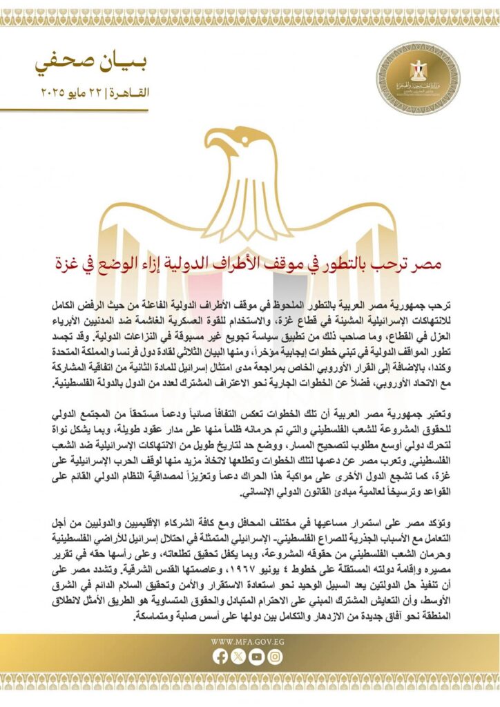 أشادت مصر، ببيانات وخطوات إيجابية، منها بيان قادة فرنسا والمملكة المتحدة وكندا، ومراجعة الاتحاد الأوروبي لاتفاقه مع إسرائيل، ومساعي دولية للاعتراف بالدولة الفلسطينية.