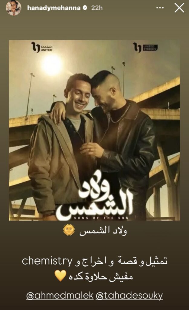 أشادت الفنانة هنادي مهنى بمسلسل ولاد الشمس، بطولة كل من طه الدسوقي وأحمد مالك، والذي بدأ عرضه خلال شهر رمضان الحالي، وحقق المسلسل نجاحًا كبيرا منذ بداية عرضه.